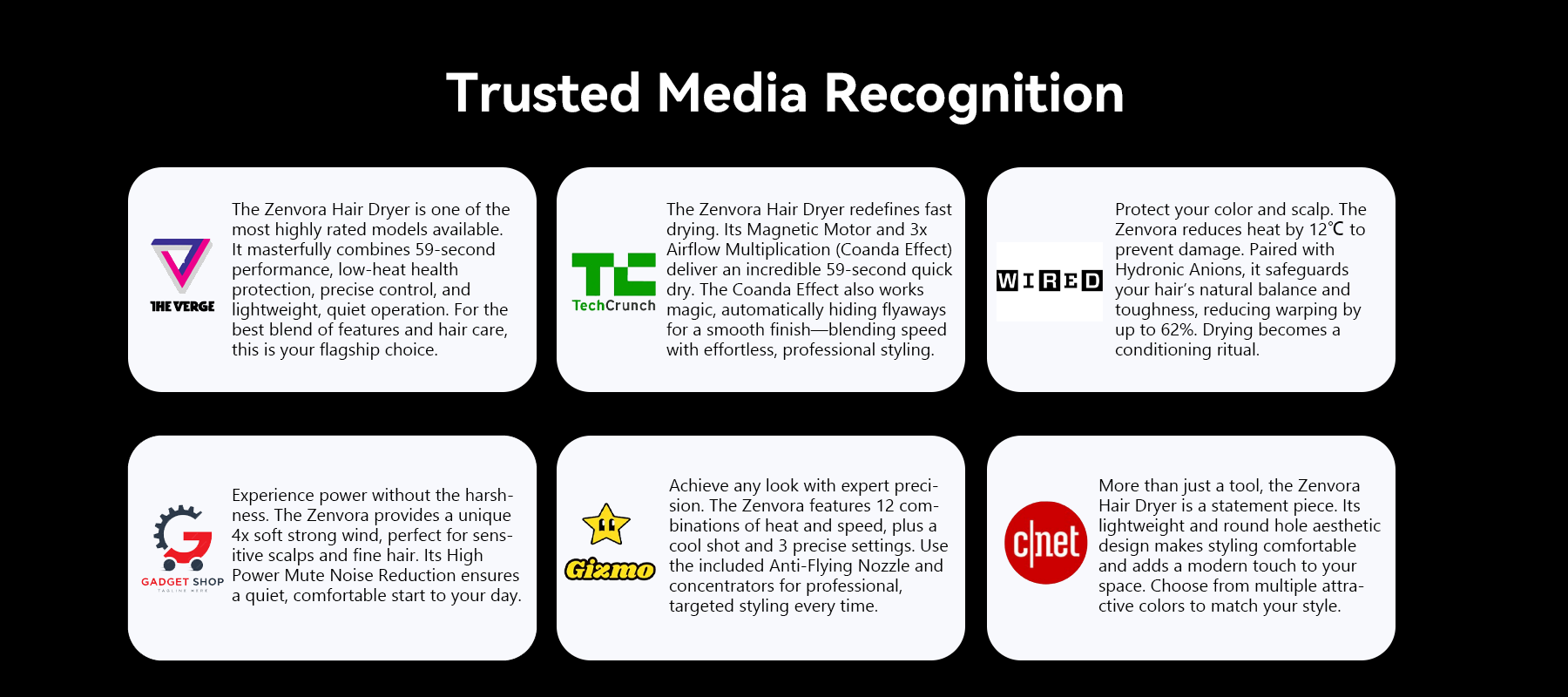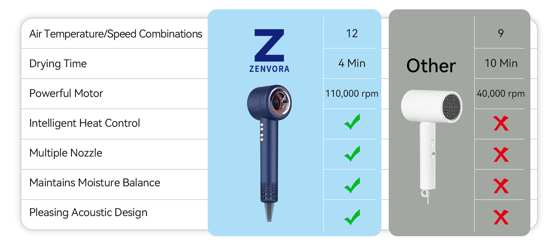 Zenvora leverages the advantage of its powerful motor to eject 3X stronger airflow. This airflow structure directly disperses moisture at the roots, achieving fast and uniform drying without the need for excessive heat. Therefore, while enjoying high-efficiency quick drying, you also receive the gentle care of intelligent temperature control.